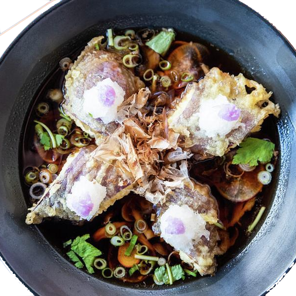 The soba is not to be outdone but is well complemented by the respect the kitchen shows for tempura. We watched as the tempura was prepared in a sparingly mixed batter of soft wheat flour, egg, and ice water. The tempura at Kamonegi is as fresh as it gets; the batter is made, just-in-time, in small batches, giving the wheat endosperm insufficient time to completely hydrate and producing a crisp diaphanous geodesic skin over each vegetable morsel. May we suggest the radish-dolloped tempura eggplant, a buoyant sponge atop a broth filled with matsutake pine mushrooms? Or have the tempura broccoli side-swiped with anchovy aioli.